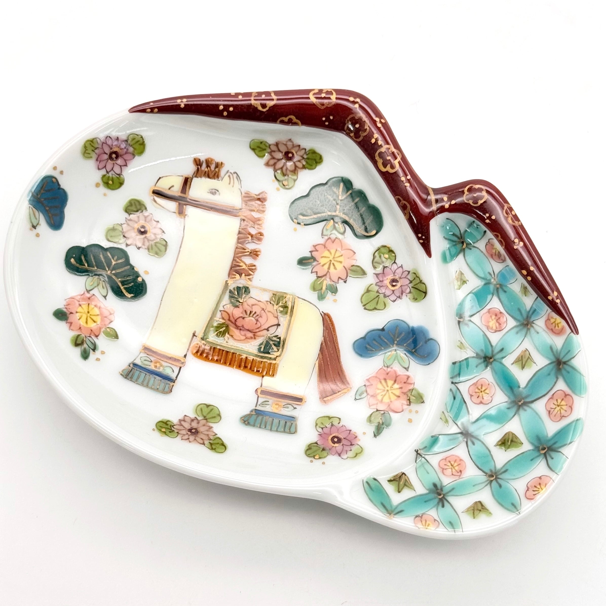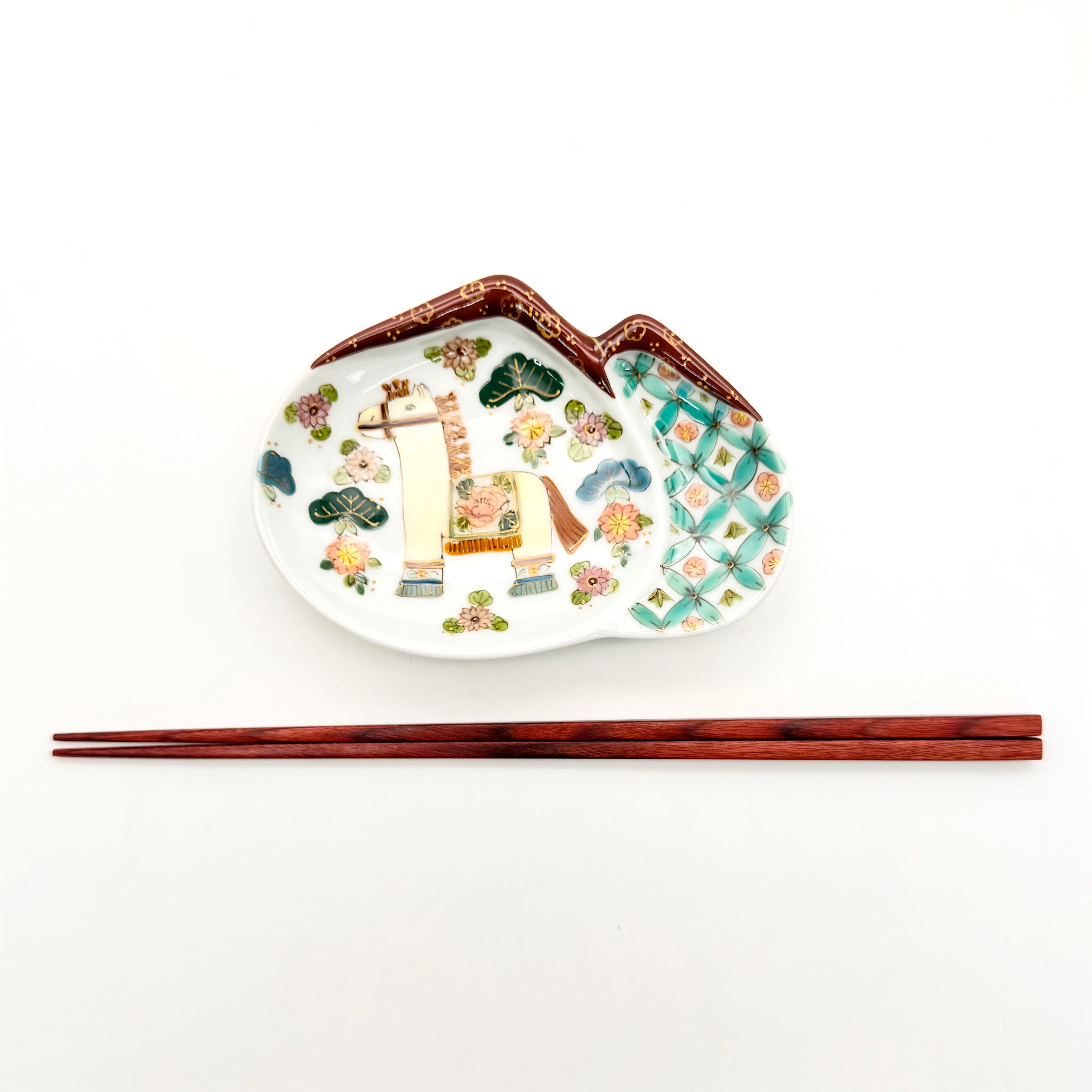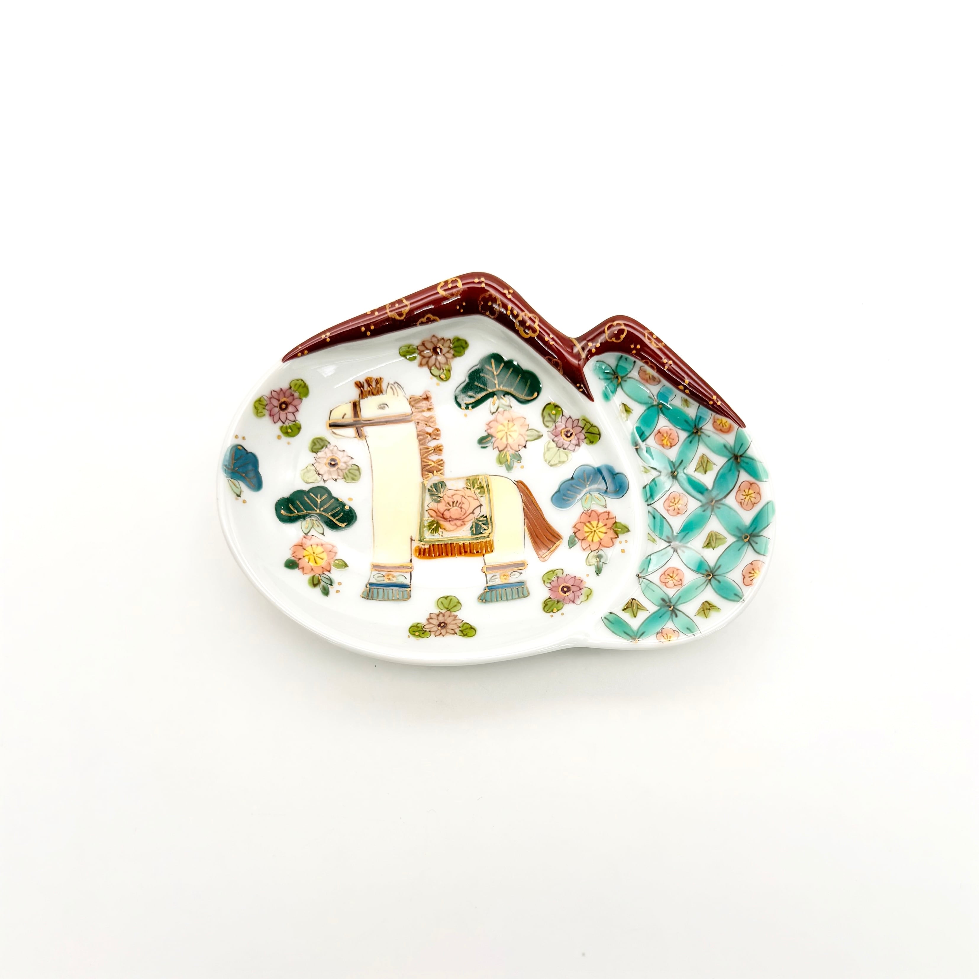 西洋絵付けを学んだのち、有田絵付けを学び、有田焼の生地に、有田の絵の具を使い、独自の色使いや絵柄が魅力的な作品です。