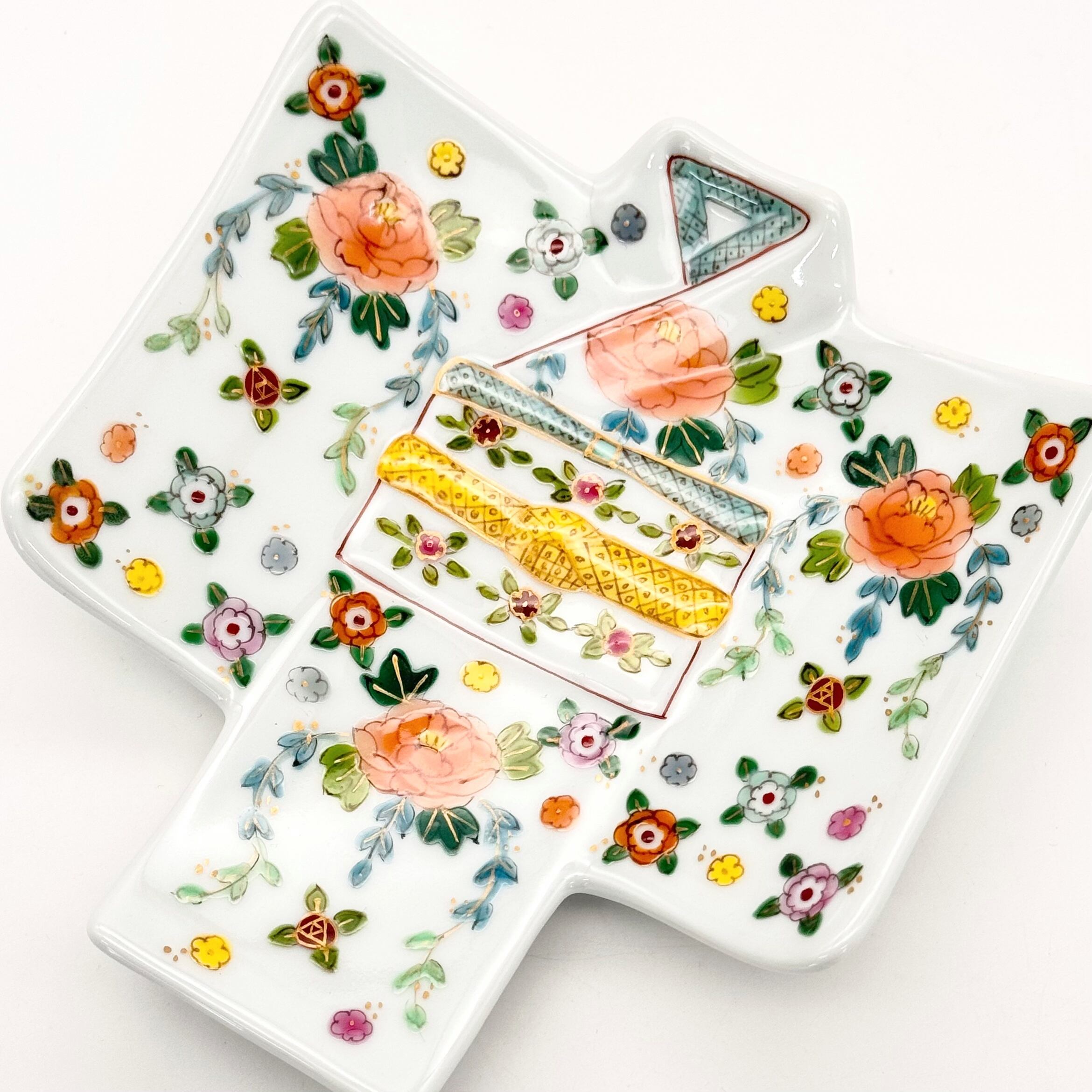 西洋絵付けを学んだのち、有田絵付けを学び、有田焼の生地に、有田の絵の具を使い、独自の色使いや絵柄が魅力的な作品です。